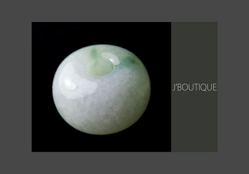 太めにデザインされた翡翠の玉環。おかゆのような透明感に渋い深緑のアクセントが目を楽しませる。